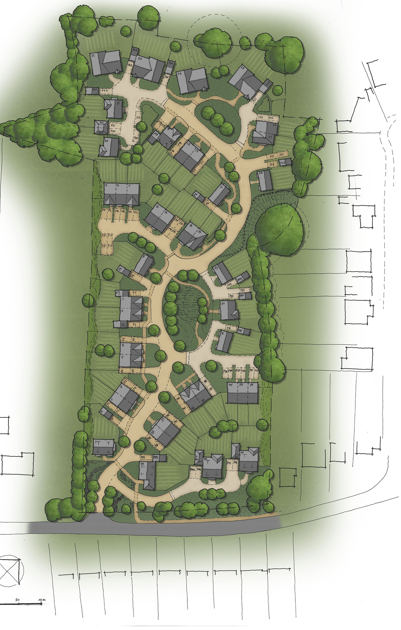 A mixture of 40 new dwellings with associated access, parking and landscaping, situated within the Greenbelt and designed to respect the character and appearance of the surrounding area. It embraces a variety of design qualities such as gateway houses, active frontages and distinctive placemaking to create an attractive residential development.